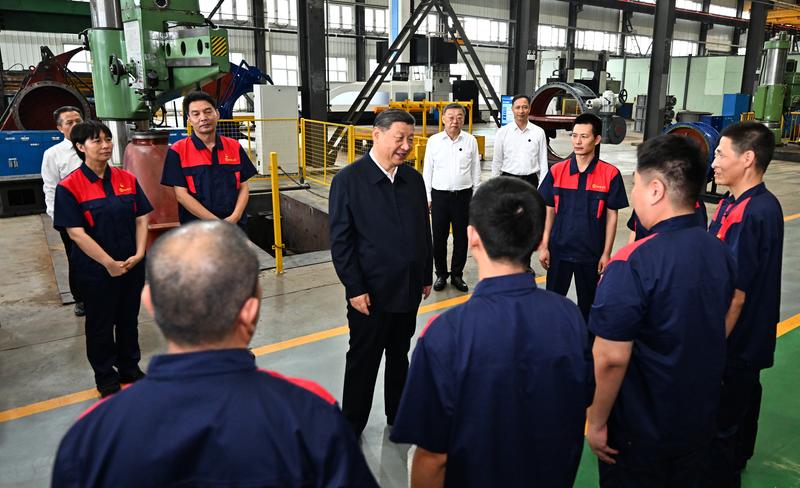 7月7日至8日,中共中央总书记、国家主席、中央军委主席习近平在山西考察。这是7日下午,习近平在阳泉阀门股份有限公司考察时,同企业员工亲切交流。新华社记者 燕雁 摄