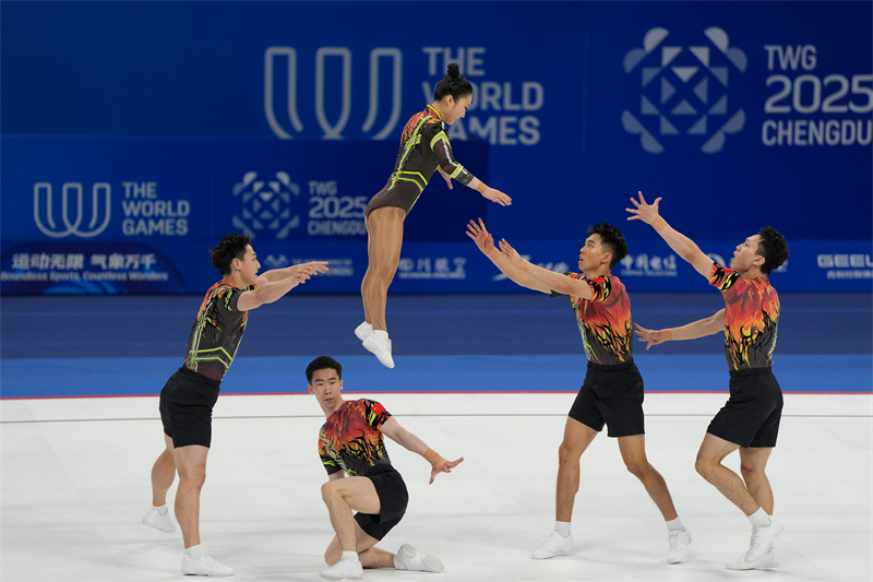 8月15日,中国队在比赛中。当日,在2025年成都世运会健美操五人操决赛中,中国队获得冠军。新华社记者 胥冰洁 摄