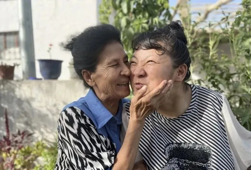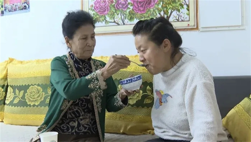 光阴流转,如今芒孜兰姆双鬓染霜,照顾生活无法自理的女儿却从未间断:清晨第一件事是抹药、按摩,喂营养粥,天气好时用轮椅推她出去晒太阳,睡前擦洗身子、检查被褥……35年里,她没睡过安稳觉,没买过新衣服,却把阿依加玛丽打扮得干干净净、漂漂亮亮。在她的照料下,阿依加玛丽从完全无法动弹,到能在搀扶下缓慢行走;从只会呜咽,到能清晰表达爱意。她常说:“妈妈很辛苦,给了我第二次生命!”