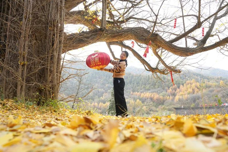 游客在榆树乡千年古银杏树下打卡。甘肃陇南文明办供图