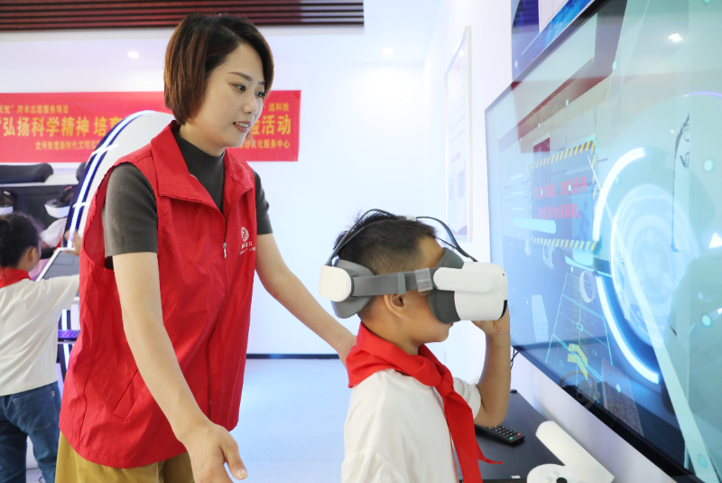 2024年9月28日,安徽省六安市叶集区史河街道柳林社区新时代文明实践站,社区志愿者在帮助小朋友体验VR技术,学习科学知识。新华网发 (田凯平 摄)