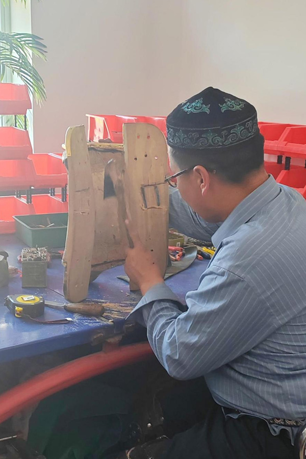 右手扶着马鞍一端,左手拿住锉刀在马鞍中间不断打磨,木屑随之纷纷掉落……近日,在乌鲁木齐经济技术开发区(头屯河区)西湖街道东南沟村非遗传承工作室里,长长的桌上摆满了铁器、电钻等工具,48岁的哈依塔依•哈木扎在神情专注地制作马鞍。经过精雕细琢,一副美观且实用的马鞍在他的手中逐渐成形。