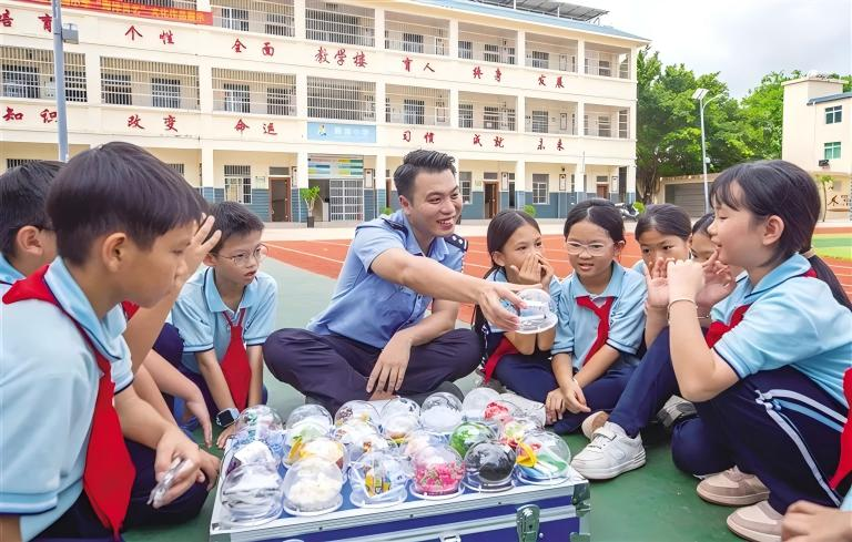 在三亚市藤海小学,派出所工作人员为学生带来一堂识毒品、知危害安全警示教育课。海南省委文明办供图