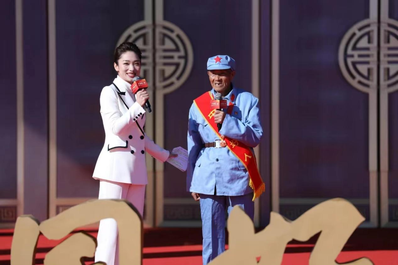 正在此时,村子里来了一大批学生参观,王茂贵特意回家换上了红军服,来到花山寨会议旧址地标前,向学生们讲述革命故事,讲到先烈们的牺牲和付出时,王茂贵潸然泪下。